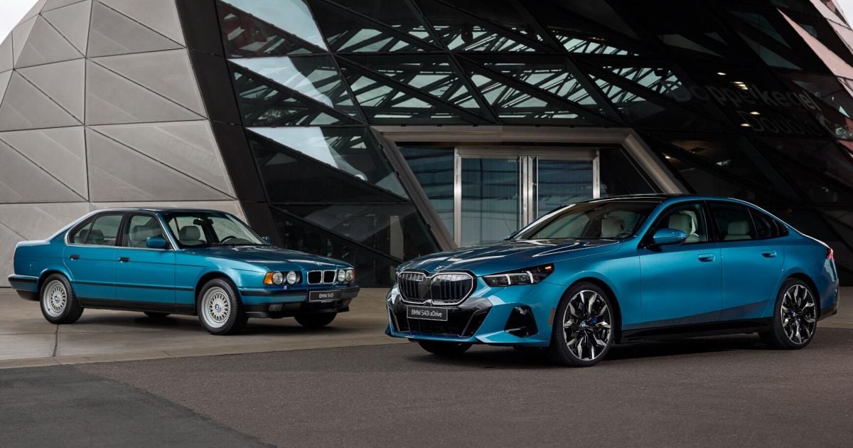 Os headliners da folha de especificações incluem a opção de não custo BMW Individual Manufactur Paintwork, como o belo Maldives Blue II Metallic mostrado aqui ao lado de um sedan E34-Gen 540i correspondente; o pacote M Sport Pro; Rodas individuais de liga leve de 21 polegadas; bem como um Bowers de 18 alto-falantes e o sistema de som surround Wilkins.