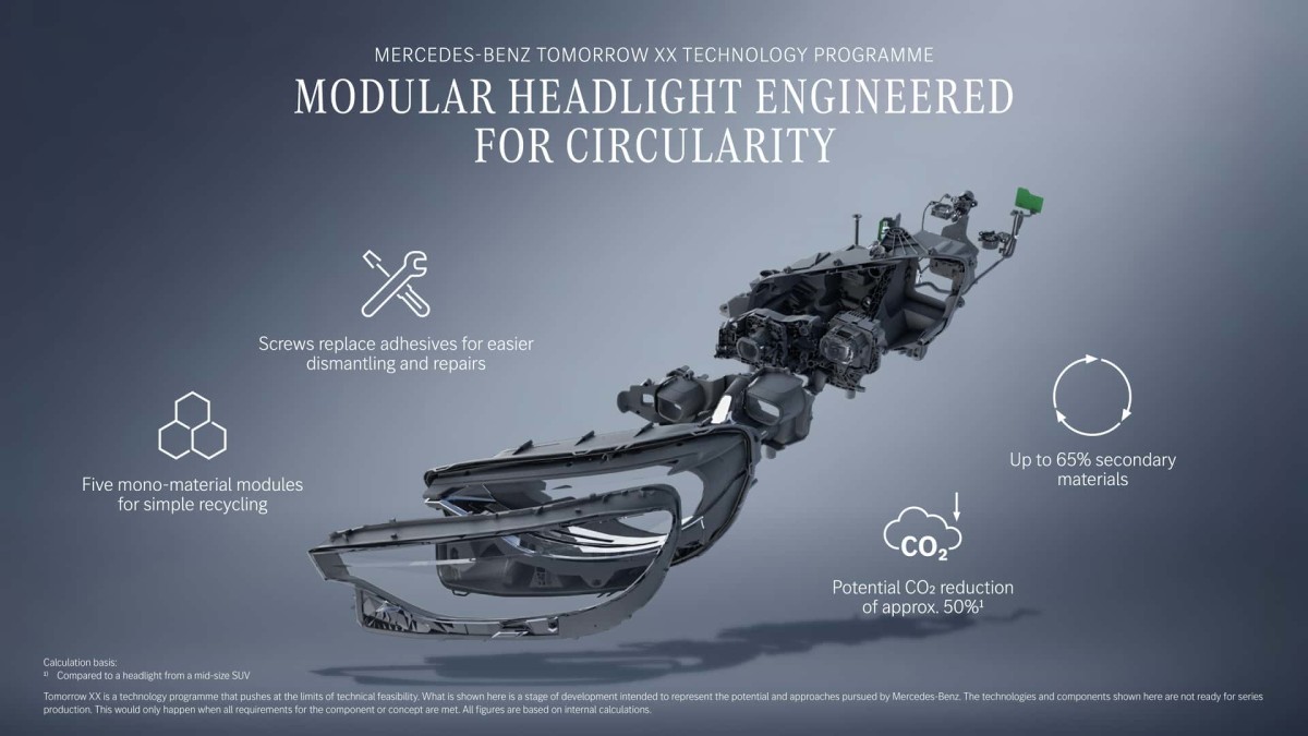 Sob a nova abordagem, a Mercedes está projetando futuras lâmpadas para serem aparafusadas em vez de coladas. A lente e a caixa são fixadas por fixadores mecânicos, e os módulos internos são dispostos para que os técnicos possam remover a tampa frontal, trocar uma lente danificada ou uma unidade de controle com falha e, em seguida, selar novamente o farol. Do lado da sustentabilidade, a empresa está a pressionar para que cada peça principal seja um único tipo de plástico, o que torna a triagem e a reciclagem muito mais fáceis quando o carro é finalmente sucateado. A marca afirma que isso poderia quase duplicar a percentagem de material reciclado num farol e reduzir a pegada de CO2 do componente em cerca de metade, sem alterar a sua função básica.