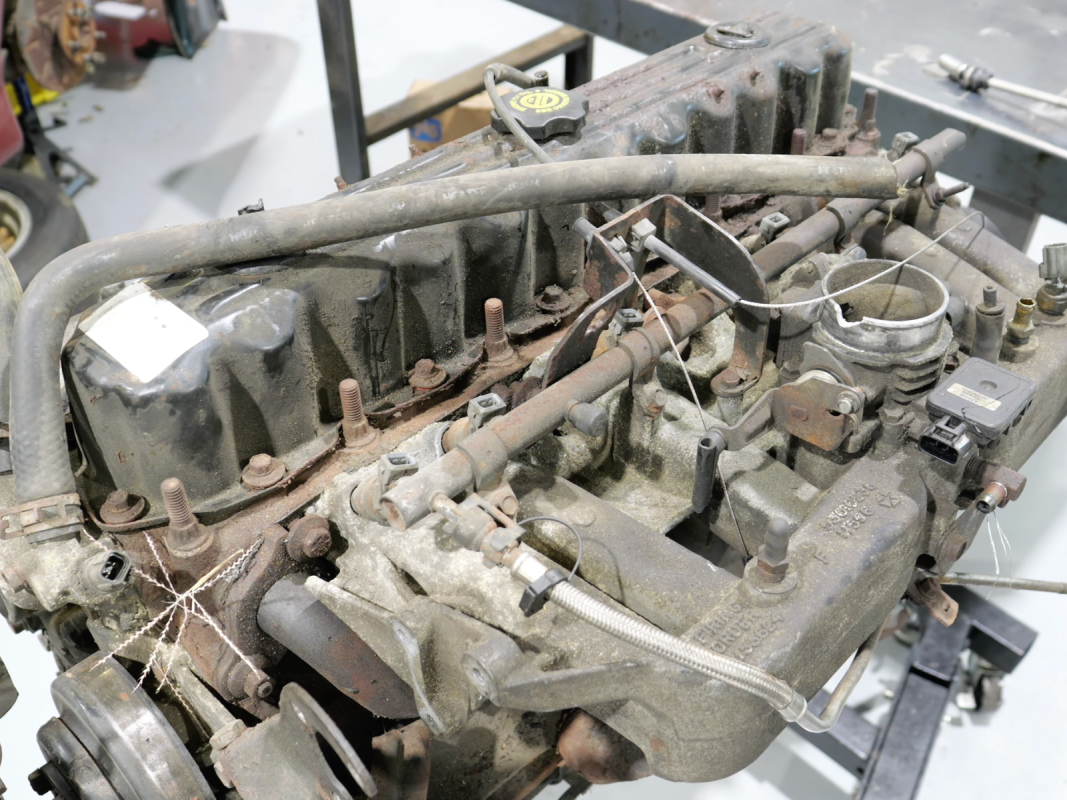 Com base nos números de peça da mangueira superior do radiador e do distribuidor, acredita-se que este motor tenha sido proveniente de um Jeep Grand Cherokee 1998, que tinha aproximadamente 185 cavalos de potência e 220 lb-pés de torque. Também foi oferecido com um motor V8 mais potente. O especialista em motores não tinha nenhum conhecimento sobre isso – nenhuma quilometragem, nenhum histórico de serviço e nenhuma explicação clara de como ele falhou. No entanto, os primeiros sinais, como buracos visíveis no cárter, já sugerem que os danos foram catastróficos.