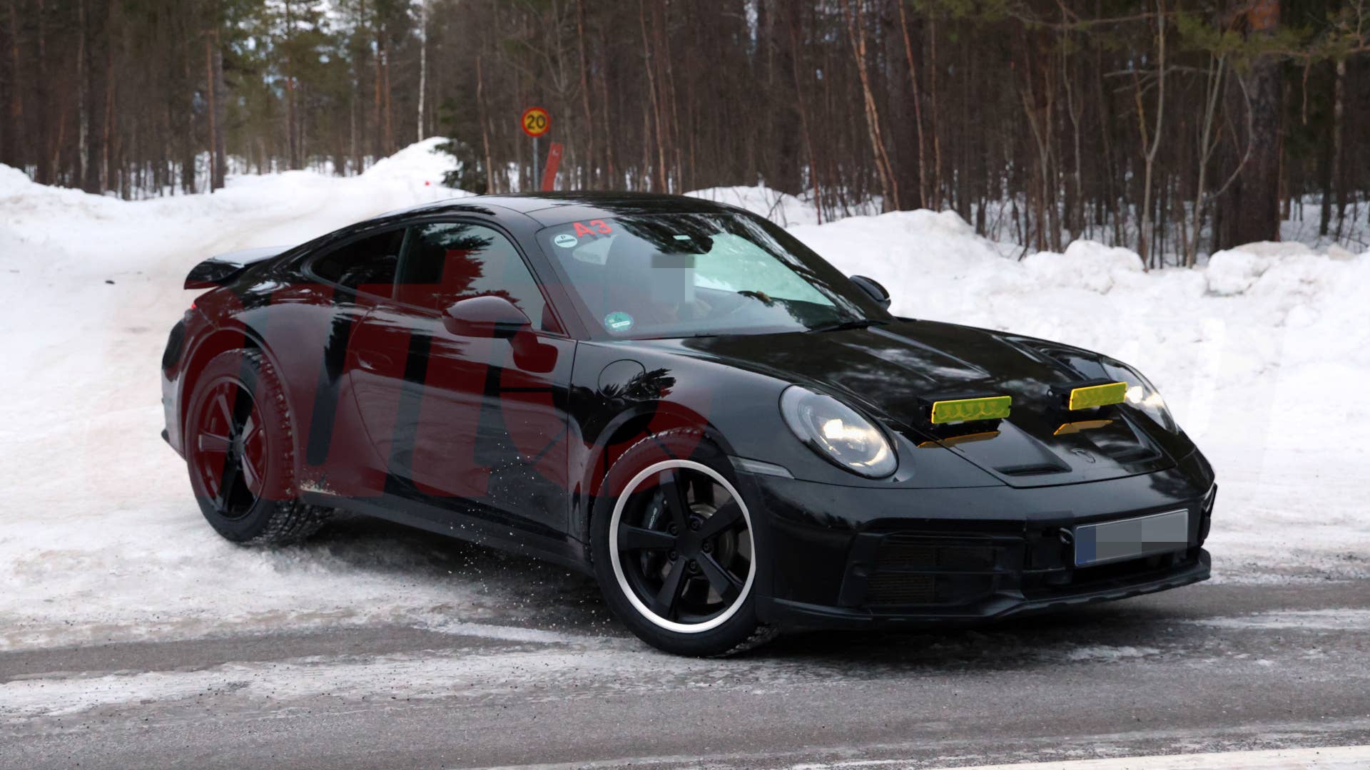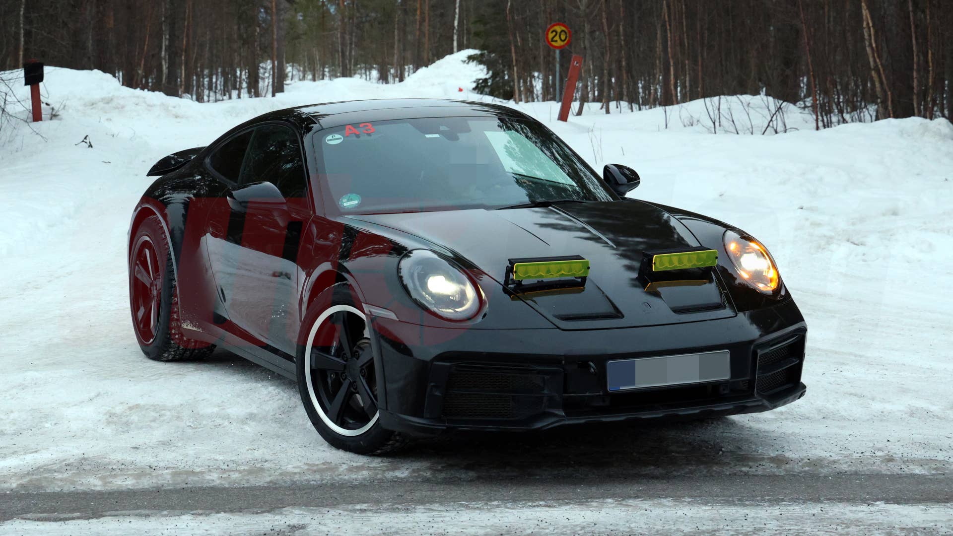 Esta mula de desenvolvimento do 911 Dakar parece estar um pouco longe de estar pronta para produção, já que os únicos sinais reveladores de que é a edição especial off-road são a altura elevada do passeio e os pneus grossos. O revestimento plástico do arco da roda do 992.1 Dakar ainda não está instalado neste protótipo, nem o spoiler dianteiro e os painéis laterais mais robustos. Este veículo de pré-produção tem um olhal de reboque saindo da frente, mas não é a peça fixa que os modelos de produção usarão, e essas grandes unidades de iluminação amarela são itens temporários usados para ajudar os engenheiros a navegar no país das maravilhas do inverno da Suécia. Da mesma forma, a traseira do protótipo ainda não está tão pronta para uso off-road quanto o 992.1 Dakar, usando um pára-choque padrão do 911. O Dakar anterior tinha suas pontas de escapamento mais espaçadas, e foi assim que o 992.1 911 GTS (no qual o Dakar foi baseado) teve suas pontas alinhadas. Como o GTS reformado os aproxima, o Dakar reformado aparentemente fará o mesmo. Por fim, vale a pena notar que este protótipo possui um spoiler traseiro amovível, enquanto o último Dakar tinha um auxílio aerodinâmico fixo. Esperamos que as mulas de teste adotem esses elementos ausentes à medida que o desenvolvimento continua.