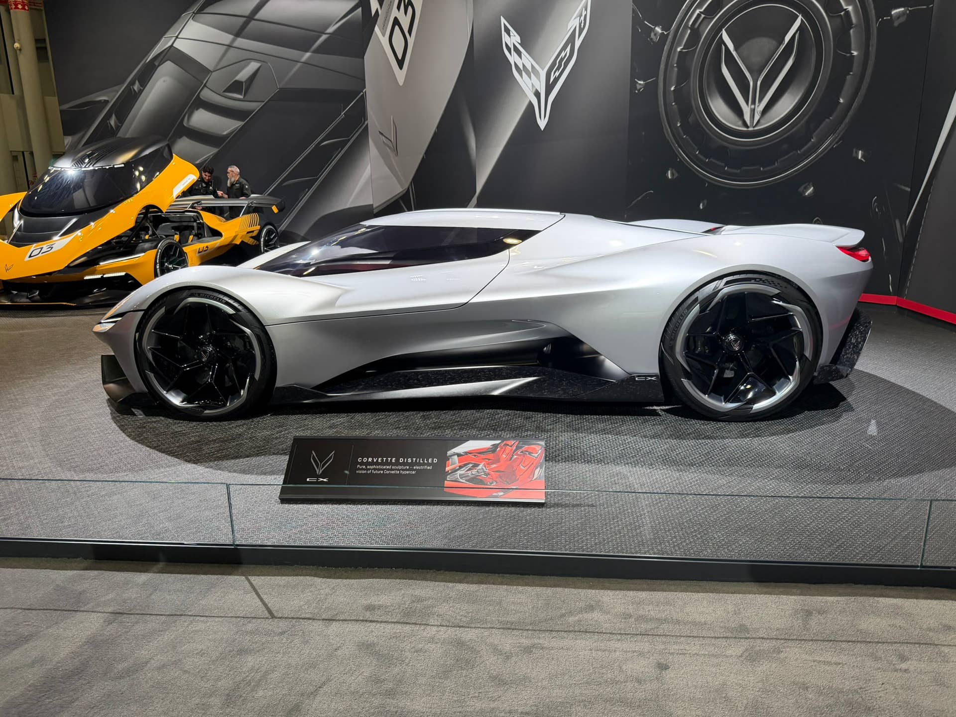 O Corvette CX Concept prateado parece que um C8 Stingray atual tem uma louca obsessão por ficção científica. Embora tenha proporções semelhantes às de uma nave espacial, não se afasta muito da linguagem de design tradicional do Corvette. Por fora, ele ostenta um design estilo hipercarro elegante e raivoso, e um tema semelhante continua por dentro. Você tem um velame inspirado em um caça a jato, que se abre conforme você se aproxima. O cockpit abraça ainda mais a sensação de um caça a jato com um design de volante semelhante ao de F1, assentos profundos, cintos de segurança e a maioria das informações tradicionais do HUD exibidas no para-brisa.
