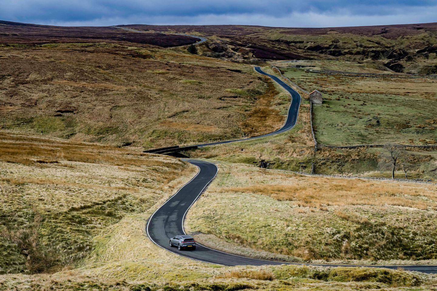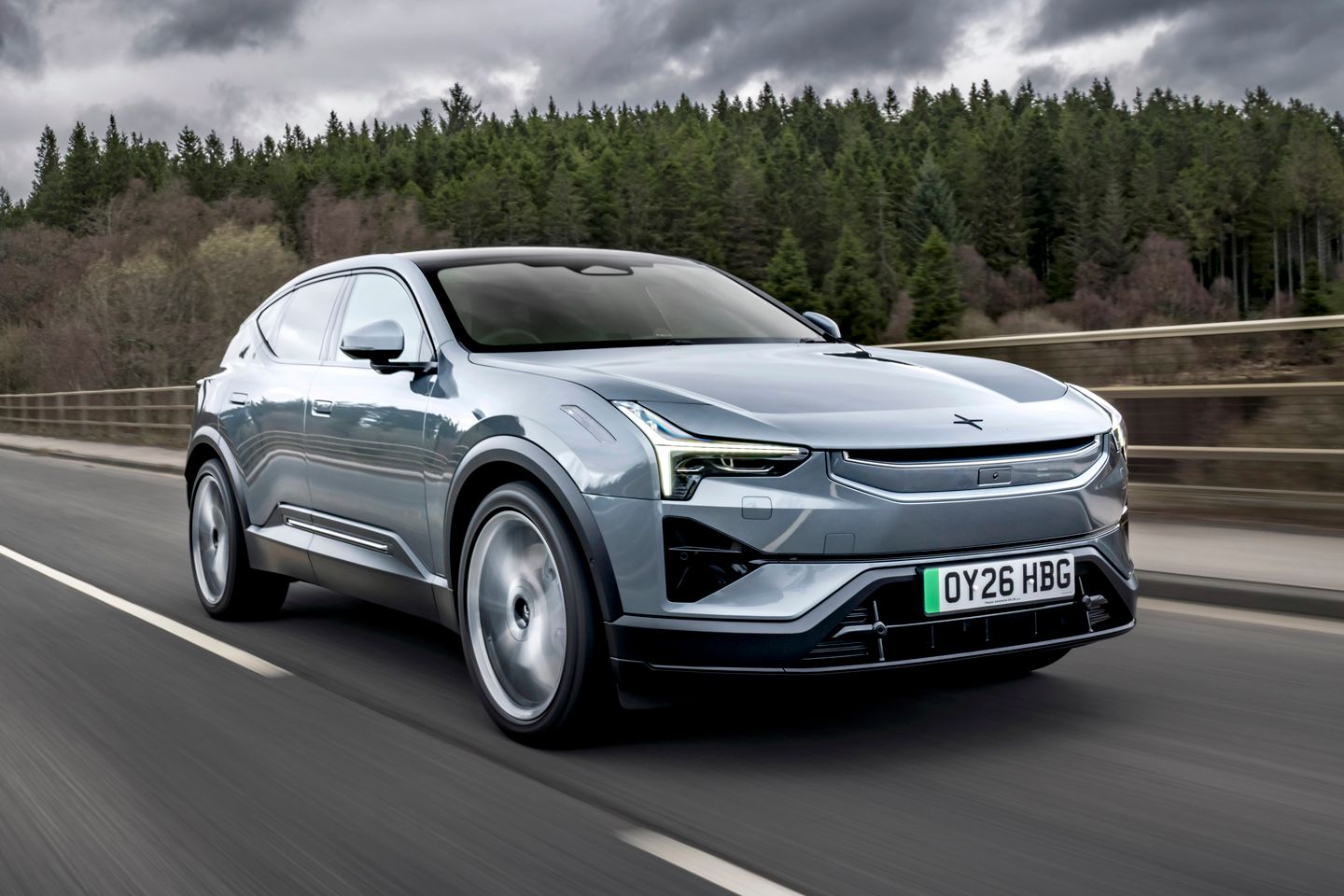 Parece que eles acertaram em cheio também. Já gostávamos bastante da forma como o Polestar 3 dirigia, e aquela frente mais ágil e composta fica evidente desde a primeira curva. Você acomoda este carro com confiança, a direção ansiosa em sua resposta, sem parecer inconstante em suas mãos. A partir daí, você pode acelerar rapidamente e sentir o eixo traseiro girando você durante a curva, enquanto a frente trabalha duro para manter sua linha precisa. Não é um carro muito expressivo, mas é infinitamente seguro, mesmo com pneus P Zero e asfalto frio. Ajuda que, em comparação com alguns rivais (ahem, BMW), o aro e a circunferência do volante pareçam do tamanho certo, garantindo que você raramente tire as mãos do nove e do três. Ele também faz um trabalho impressionante ao sentir menos do que suas 2,5 toneladas, sentindo-se muito mais ágil do que alguns, sem perseguir uma dinâmica frenética para alcançá-lo.